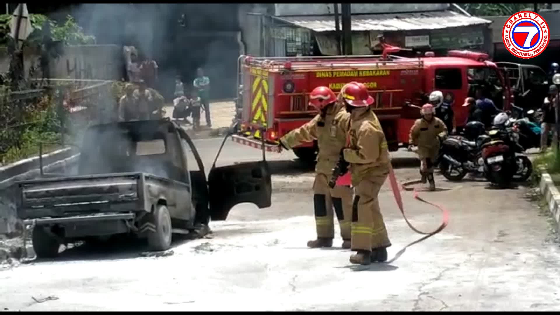Setelah beberapa saat, Tim Pemadam Kebakaran Bogor datang dangsung langsung dengan Sigap memadamkan Api yang membakar Mobil pick up tersebut hingga padam.