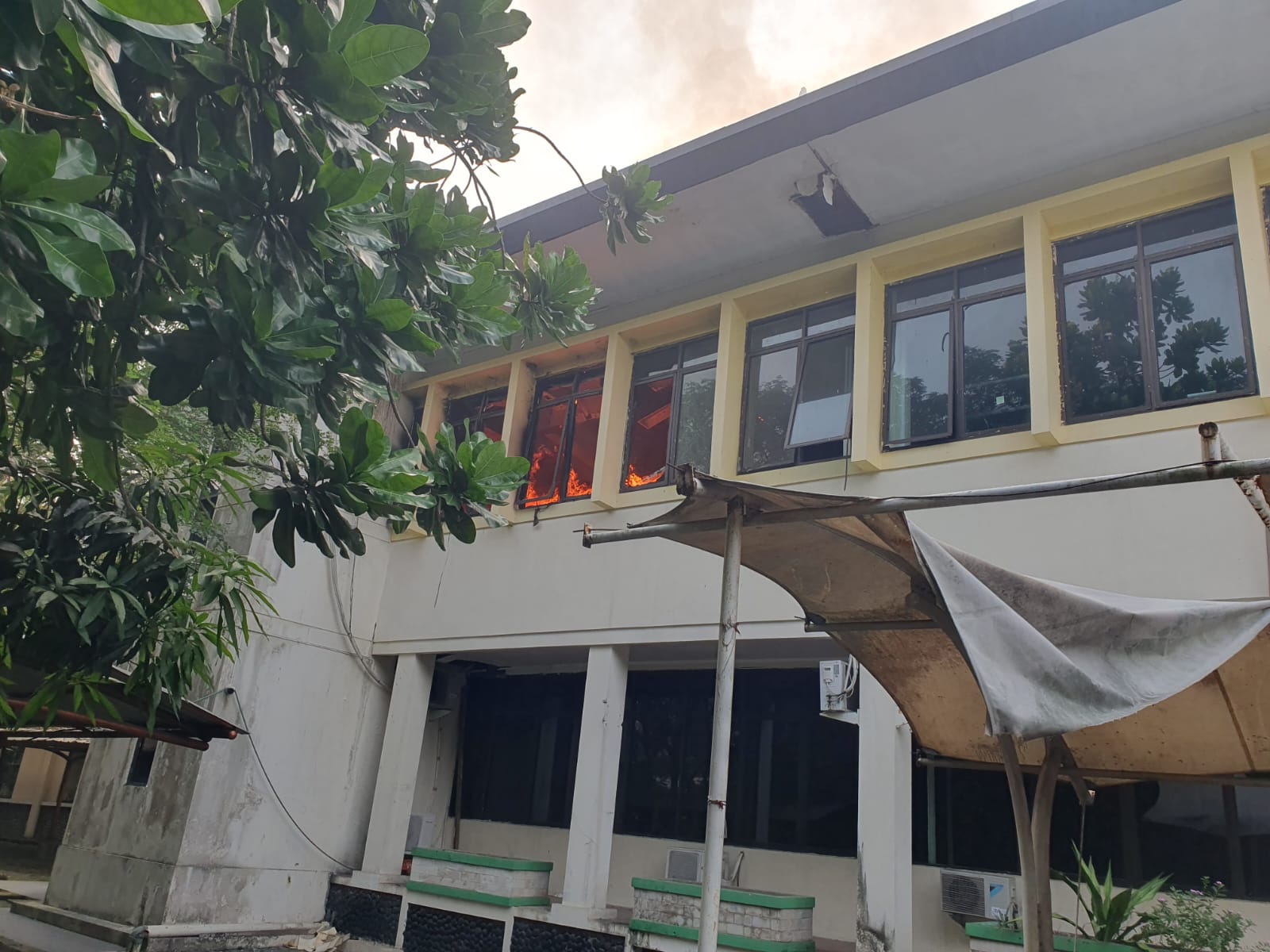 Sementara itu, video berdurasi 11 detik memperlihatkan, kepulan asap hitam dan kobaran api menghanguskan ruangan dan sejumlah jendela di lantai dua.