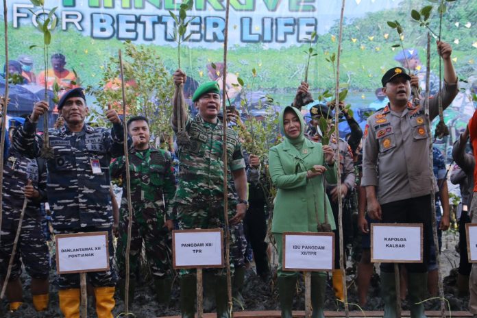 CHANEL7.TV, MEMPAWAH,  – Guna menjaga ekosistem di wilayah pesisir, Panglima Kodam XII/Tanjungpura Mayjen TNI Iwan Setiawan, S.E., M.M., memimpin Puncak Penanaman Mangrove Nasional secara serentak oleh TNI TA 2023 di wilayah Kalimantan Barat bertempat di Desa Sungai Bakau Besar Laut, Kecamatan Sungai Pinyuh, Kabupaten Mempawah pada Senin (15/5/2023).