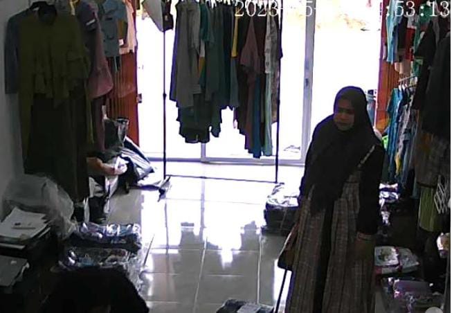 Dalam rekaman CCTV, pelaku dengan ciri ciri berkerudung, mengenakan baju gamis mengecoh karyawan toko dengan meminta dicarikan sejumlah model pakaian.