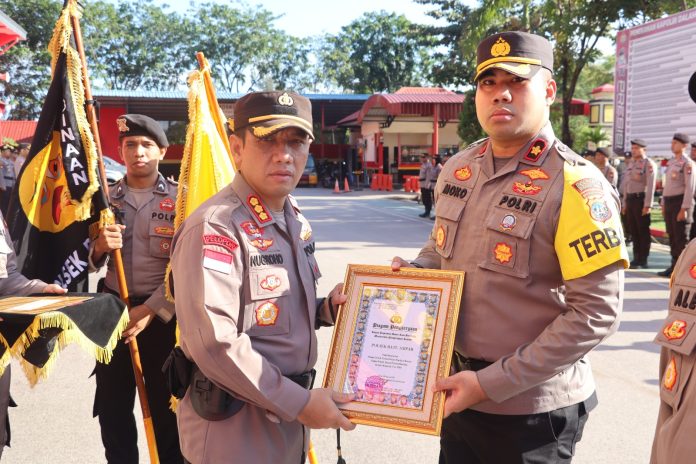 CHANEL7.TV, BATAM – Kapolresta Barelang Kombes Pol Nugroho Tri N, SH, SIK, MH pimpin Upacara Pemberian Penghargaan Kepada Polsek Terbaik Jajaran Polresta Barelang Periode Bulan Juli 2023 bertempat di Lapangan Apel Mapolresta Barelang. Senin (07/08/2023)