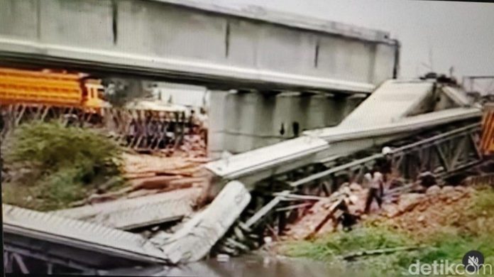 CHANEL7.TV, KOTA BEKASI – Konstruksi proyek jembatan penghubung di kawasan Jababeka, Cikarang Timur, Bekasi, roboh. Dua orang pekerja terluka.