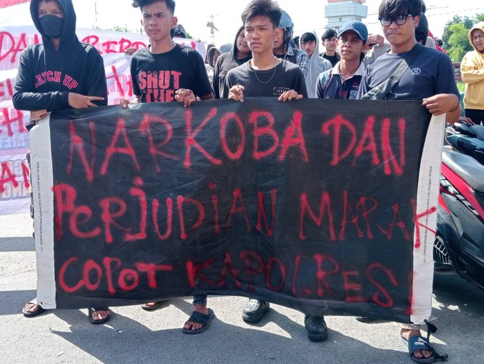Pantauan di lokasi, massa membawa sejumlah spanduk berisi tuntutan yang ditulis menggunakan cat semprot merah. Salah satu spanduk utama bertuliskan, “Narkoba dan Perjudian Marak, Copot Kapolres!”.