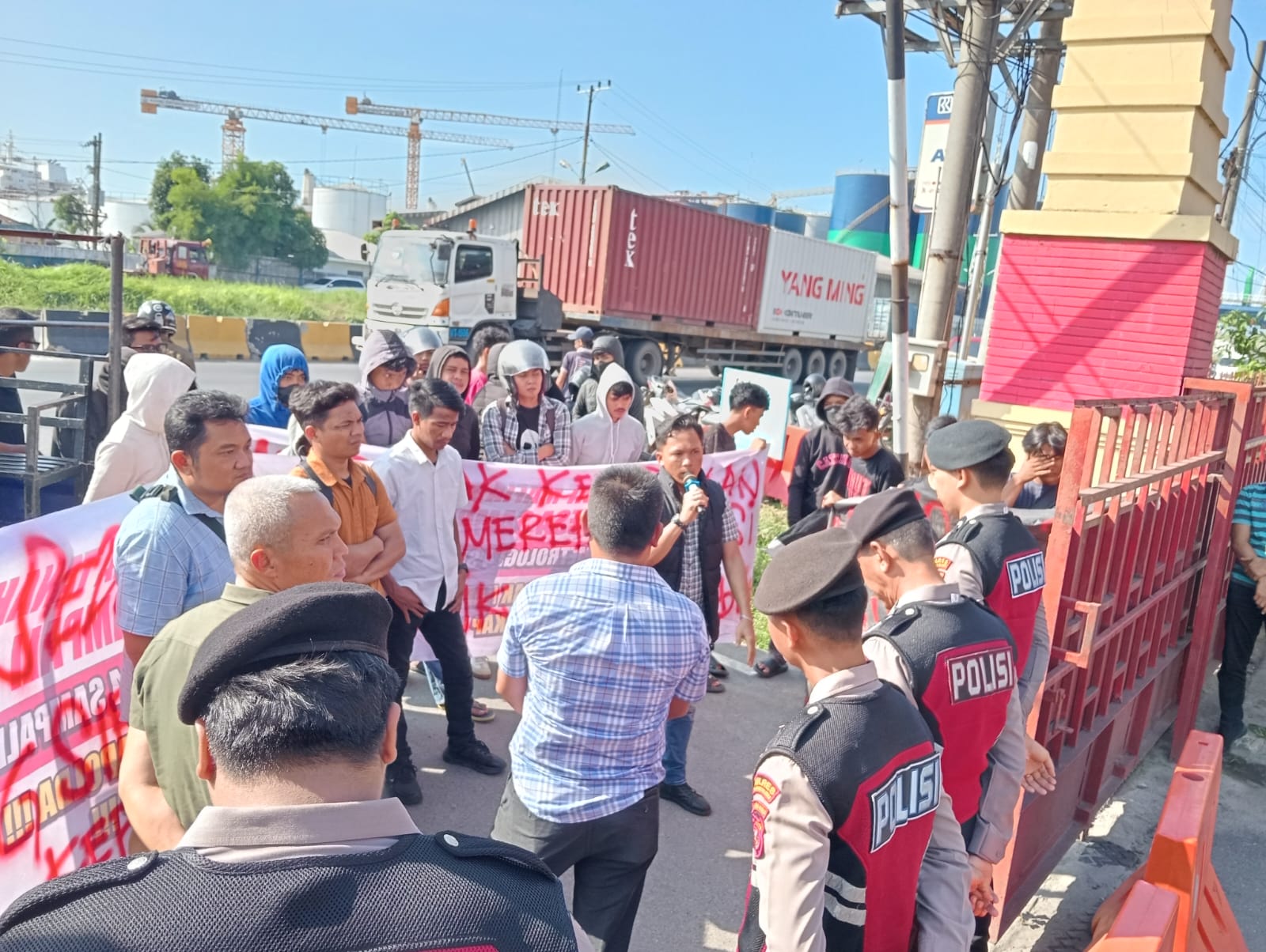 CHANEL7.TV, BELAWAN – Sejumlah massa yang mengatasnamakan masyarakat melakukan aksi unjuk rasa di depan pintu masuk Markas Kepolisian Resor (Mapolres) Pelabuhan Belawan pada Kamis (16/04).