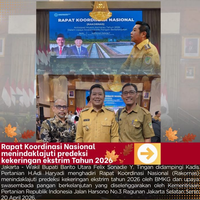 CHANEL7.TV, JAKARTA – Wakil Bupati Barito Utara, Felix Sonadie Y. Tingan, A.Md., menghadiri Rapat Koordinasi Nasional (Rakornas) yang digelar Kementerian Pertanian Republik Indonesia di Jakarta, Senin (20/4/2026). Kegiatan ini membahas langkah strategis menghadapi potensi kekeringan ekstrem serta upaya mewujudkan swasembada pangan berkelanjutan.